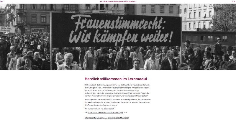 Die Lernplattform der Eidgenössischen Kommission für Frauenfragen gibt in elf Lernmodulen und einem Prüfungsmodul einen breiten Einblick in die Funktionsweise und Geschichte der Schweizer Demokratie. Durch die Reflektionsfragen, Bilder und Videos setzen sich die Lernenden mit der damaligen Wertehaltung auseinander und erkennen, wie sich Werte über die Zeit wandeln. Was uns heute unverständlich erscheint, war damals normal. Ausserdem werden die Lernenden ermuntert, Machtverhältnisse zu analysieren und Fragen nach politischer Partizipation zu stellen.