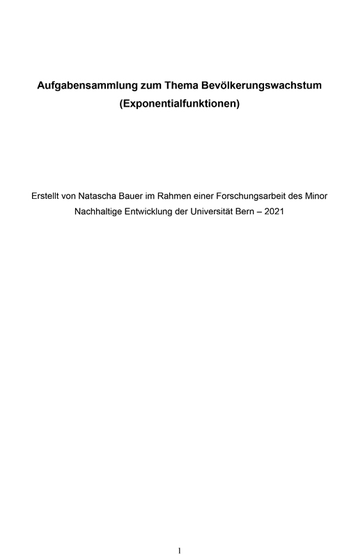 Integration von BNE ist in jedem Fach möglich. Nach einem thematischen Einstieg zum Bevölkerungswachstum werden darauf aufbauend Exponentialgleichungen im Mathematikunterricht gelernt und angewendet. In 4-6 Lektionen werden Aufgaben zu Unterthemen wie Entwicklung, Demographie, Generationenfragen, Ressourcenknappheit und weitere wichtige BNE-Themen verknüpft. In den ersten Aufgaben wird das Bevölkerungswachstum der Schweiz berechnet und mit anderen Ländern verglichen und später in Beziehung zur Umwelt und zu vorgegebenen Zukunftsszenarien, wie auch eigenen Vorstellungen und Fragen gesetzt.