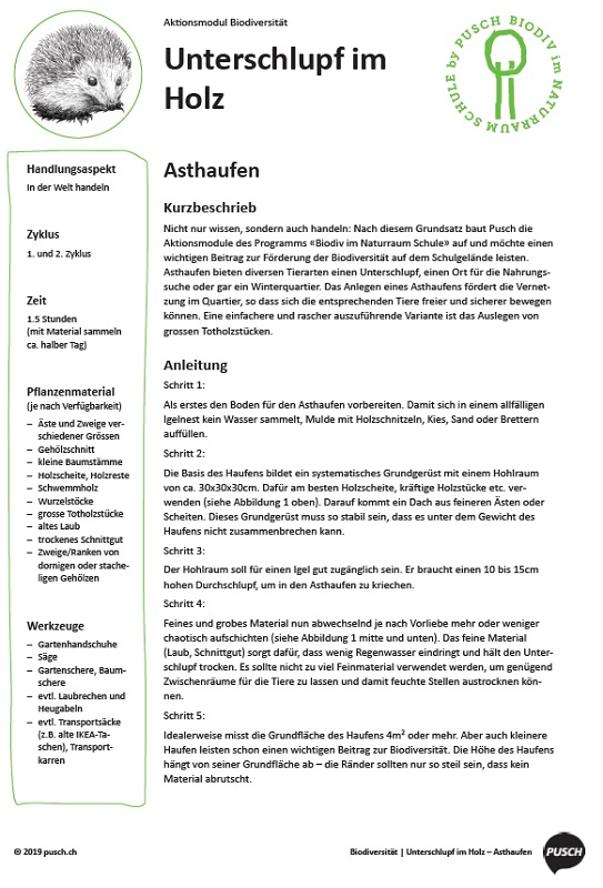 Das Programm «Biodiversität im Naturraum Schule» unterstützt Primarschulen bei der ökologischen Aufwertung ihrer Areale. Sechs Aktionsmodule und Unterrichtsmaterial stehen als PDFs zur Arbeit mit der Klasse zur Verfügung. Die Aktionsmodule leiten an zur Gestaltung von Kleinstrukturen (Asthaufen, Bienenweide, Samenkugeln, Steinhaufen, Nützlingsquartiere, Stäucher) und machen damit das Schulareal zum Lernort. Jedes Modul beschreibt die Arbeitsschritte, gibt Tipps zu Absprachen, zur Materialbeschaffung, dem Standort und der Pflege. Die Module liefern Hintergrundinfos, erläutern die didaktische Einbettung und geben Ideen zur Vertiefung des Themas im Unterricht.