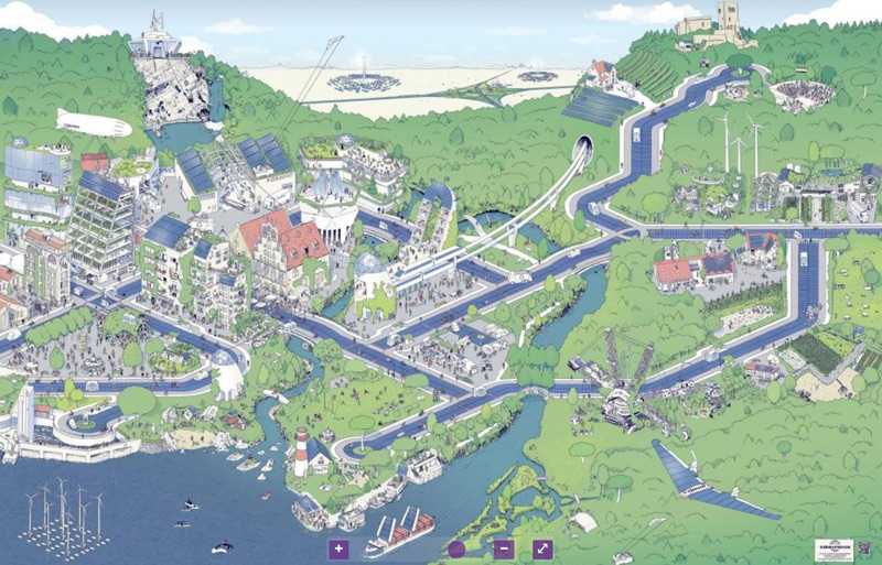 Wie sieht ein gutes Leben für alle aus? Das Wimmelbild zeigt eine mögliche Zukunftssituation, in der es allen Menschen und der ökologischen Mitwelt gut geht. Aber natürlich könnte diese positive Zukunftsversion auch anders aussehen. Für Gesprächsstoff ist gesorgt!