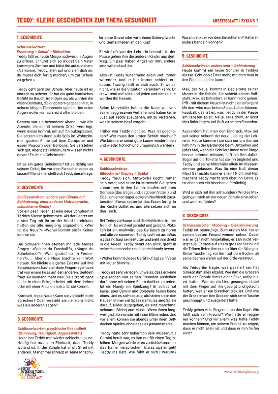 Zyklus 1: Anhand von mehreren kurzen Geschichten sollen den Kindern ihre eigenen gesundheitlichen Bedürfnisse und die Bedeutung von zwischenmenschlichen Beziehungen bewusst werden.