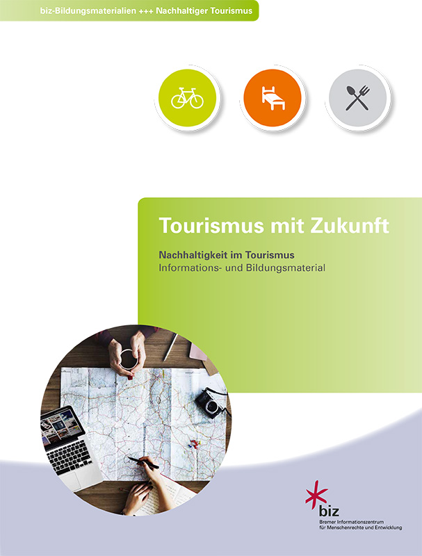 Die fiktive, etwas simple Kurzgeschichte des Tourismuskaufmanns Rainer Reisgern, der seinen Urlaub in einem Eco-Ressort verbringt und das erste Mal in Berührung mit den Vorzügen des nachhaltigen Tourismus kommt, dient als Einstieg in die Thematik. Auf je einer Doppelseite veranschaulicht die Broschüre einfach, praxisnah und trotzdem differenziert Fakten und Informationen zu Zielen, Konzepten, Akteuren und Richtlinien eines nachhaltigen Tourismus. Die Arbeitsmaterialien auf der beigelegten CD-ROM (Word, PDF und PPP) ermöglichen eine vertiefte Auseinandersetzung anhand von Diskussionsanregungen, Text-/Film-Bearbeitungen und einem Rollenspiel. Die Broschüre (auch im Klassensatz) inklusive CD-Rom ist gratis zu beziehen beim Bremer Informationszentrum für Menschenrechte und Entwicklung www.bizme.de.