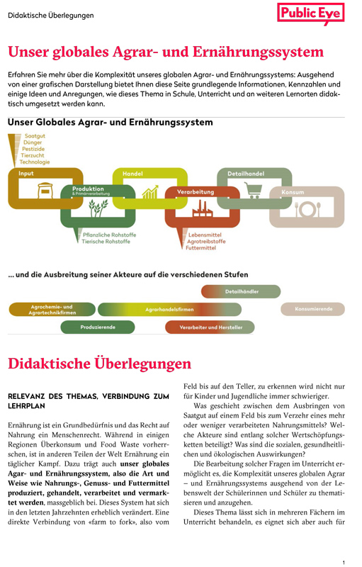 Für die Thematisierung des Agrar- und Ernährungssystems als Ganzes und für drei Stufen Produktion, Detailhandel und Konsum finden sich auf der Website konkrete Umsetzungsideen für den Unterricht. Eine visuelle Darstellung gibt Orientierung zu den verschiedenen Stufen des Agrar- und Ernährungssystems sowie den involvierten Akteuren.