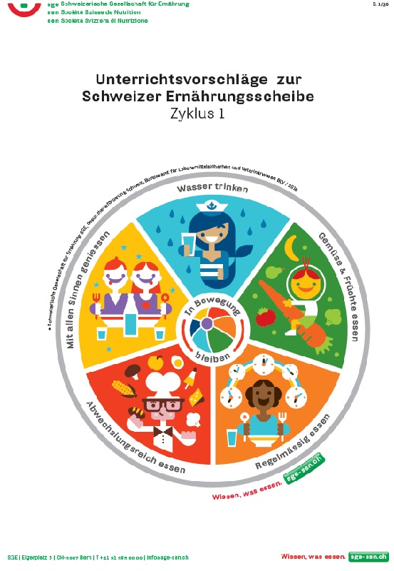 Die Unterrichtsvorschläge für den Zyklus 1 geben Anregungen, wie Kompetenzen und Wissen rund um die Ernährung altersgerecht sowie praxisorientiert vermittelt werden können. Die Vorschläge basieren inhaltlich auf den Empfehlungen der Schweizer Ernährungsscheibe für Kinder und orientieren sich am Lehrplan 21. Auf spielerische und konkrete Weise werden die fünf Bereiche «Wasser trinken», «Gemüse & Früchte essen», «Abwechslungsreich essen» und «Mit allen Sinnen geniessen» angesprochen und mit weiteren Themen der Nachhaltigen Entwicklung (lokal/saisonal, Ressourcenproblematik, Food Waste, etc.) verbunden. Die Kinder sollen dabei erkennen, dass das persönliche Ernährungsverhalten auch grossen Einfluss auf Umwelt, Wirtschaft und Gesellschaft hat.