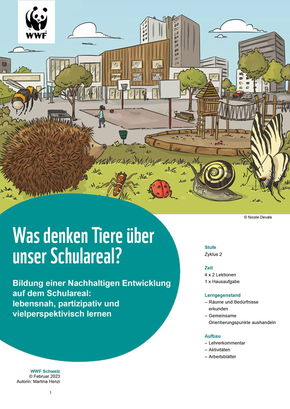Neben verschiedenen Menschengruppen beleben auch diverse Tiere und Pflanzen das Schulgelände. Aber wem gehört eigentlich das Schulareal? Und wer kann, darf oder möchte es wie nutzen? Neben der Vermittlung von Artenkenntnis führt das Lehrmedium hin zur Frage der Nutzung von Gemeingütern. Verschiedenen Bedürfnisse sollen erkannt und Möglichkeiten einer für alle befriedigenden Nutzung gesucht werden.