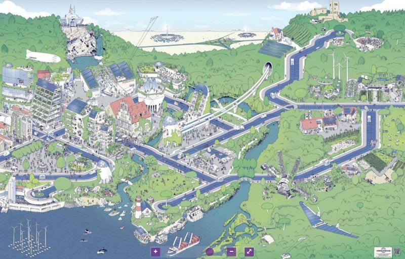 Wie sieht ein gutes Leben für alle aus? Das Wimmelbild zeigt eine mögliche Zukunftssituation, in der es allen Menschen und der ökologischen Mitwelt gut geht. Aber natürlich könnte diese positive Zukunftsversion auch anders aussehen. Für Gesprächsstoff ist gesorgt!