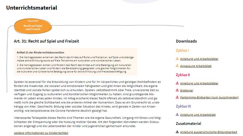Die Unterrichtsimpulse zum Kinderrechtstag 2021 behandeln das Recht auf Spiel und Freizeit. Spielen ist essenziell für die Entwicklung von Kindern und für ihr körperliches und geistiges Wohlbefinden: es fördert die Kreativität, die sozialen und personalen Kompetenzen und gibt ihnen die Möglichkeit, eigene Standpunkte zu erkunden.