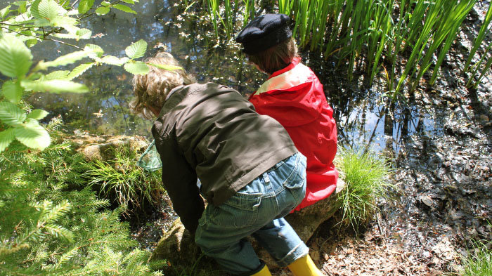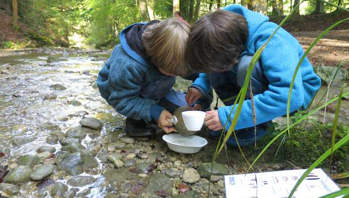 In Gummistiefeln, mit Fangnetz und Becherlupe ausgerüstet einen Bachlauf entlang stiefeln und dabei den Fliessgewässern auf den Grund gehen.Wasserdetektive (Verein Grünwerk - Mensch & Natur)
