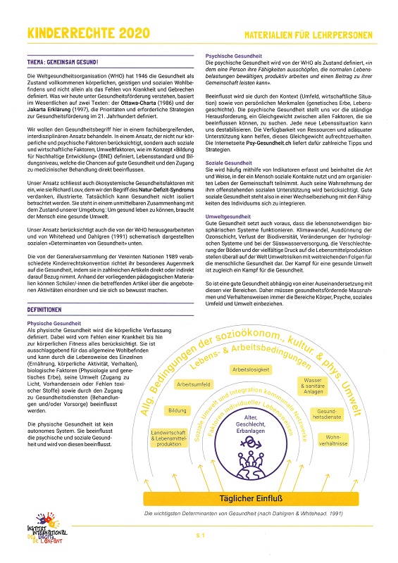 In den Unterrichtsimpulsen zum Kinderrechtstag wird der Gesundheitsbegriff in einem fachübergreifenden, interdisziplinären Ansatz behandelt. So werden nicht nur körperliche und psychische, sondern auch soziale, wirtschaftliche und ökologische Faktoren beleuchtet. Zyklus 3: Die Schüler/-innen reflektieren eigene Verhaltensweisen in Bezug auf ihr Wohlbefinden und setzen sich mit der globalen Gesundheitssituation und der Bedeutung der Kinderrechtskonventionen auseinander.Kinderrechte 2020: "Gemeinsam gesund!" - Dossier für Lehrpersonen