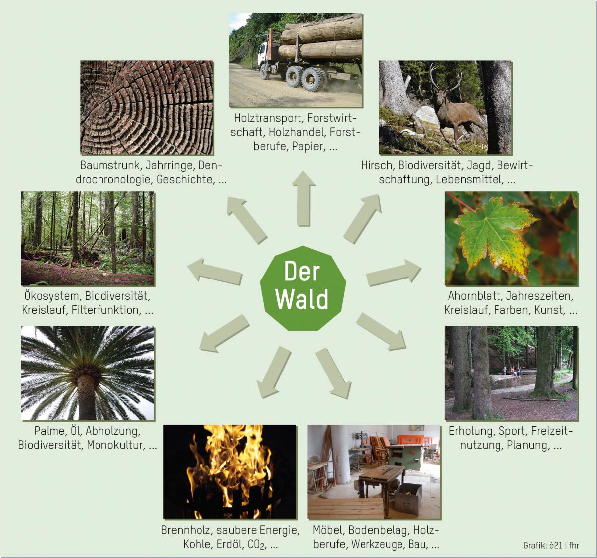 Um den Wald als Wirtschaftsraum zu verstehen, untersuchen die Schülerinnen und Schüler lokale und globale Folgen der Ressourcennutzung und diskutieren Ansätze für einen nachhaltigen Umgang (NT 3.3). Sie lernen Holz als natürliche Ressource und Energieträger kennen (RZG 1.4) und beschäftigen sich mit Produktionsprozessen ausgewählter Holzprodukte. Dabei beziehen sie ökonomische, soziale und ökologische Überlegungen mit ein (WAH 1.3).