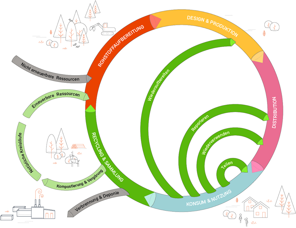 Die Ressourcen der Erde sind aber nicht unbegrenzt: Bereits 2009 stellten Rockström et al. das Konzept der planetaren Grenzen vor. Heute sind vier davon überschritten, wodurch unsere Existenz bedroht ist (Steffen et al. 2015). Vor diesem Hintergrund und unter Berücksichtigung der komplexen Verflechtungen zwischen Wirtschaft, Wohlstand und Ökologie schlägt die KLW eine alternative Sichtweise vor. Alle Materialien und Produkte werden soweit wie möglich im Kreis behalten und erst in letzter Instanz recycelt. So werden weniger Ressourcen verbraucht und weniger Abfälle erzeugt.