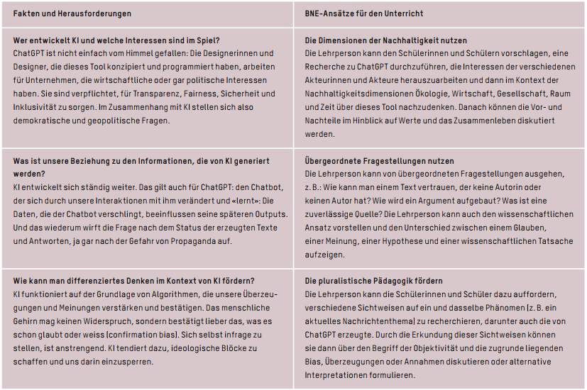Fakten und Herausforderungen im Zusammenhang mit KI und BNE-Ansätze für den Unterricht am Beispiel ChatGPT; eigene Darstellung.