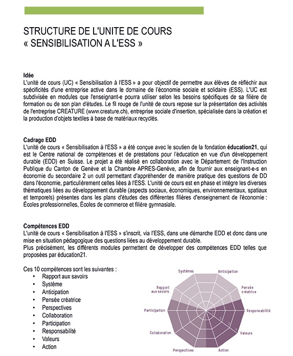 L'unité de cours "Sensibilisation à l'ESS" (Economie Sociale et Solidaire) propose 6 modules à choix pour approcher de manière très factuelle l'ESS en s'appuyant sur le modèle d'une entreprise existante, CREATURE. Ils permettent à l'enseignant-e une approche différente de l'économie, clairement située dans le contexte du développement durable.Les gratte-ciel
