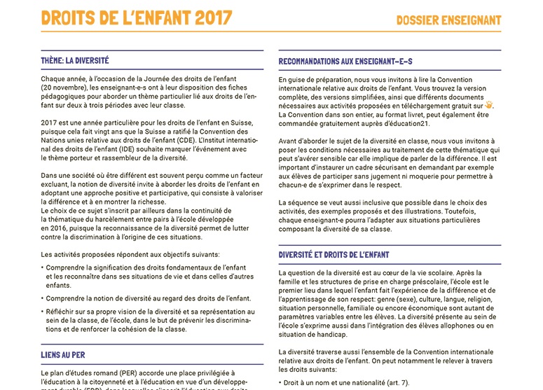 Les Fiches pour le cycle 2 permettent de travailler, sur 2 à 3 périodes, les objectifs suivants: identifier et reconnaître les droits fondamentaux de l’enfant; comprendre la notion de diversité au regard des droits de l’enfant; réfléchir sur sa propre vision de la diversité et sa représentation au sein de la classe, dans le but de prévenir les discriminations et renforcer la cohésion du groupe.L'enseignement moral