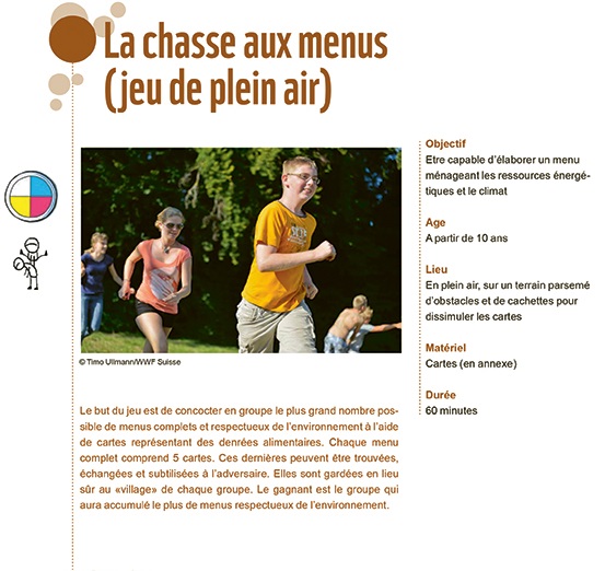 Ce guide vous permet d'approfondir vos connaissances sur la balade en tant qu'outil pédagogique pour l'éducation au développement durable (EDD). Après la lecture du guide, vous serez prêt à vous lancer dans une nouvelle aventure qui vous permettra d'enseigner de façon régulière en dehors de la classe !La chasse aux menus (jeu de plein air)