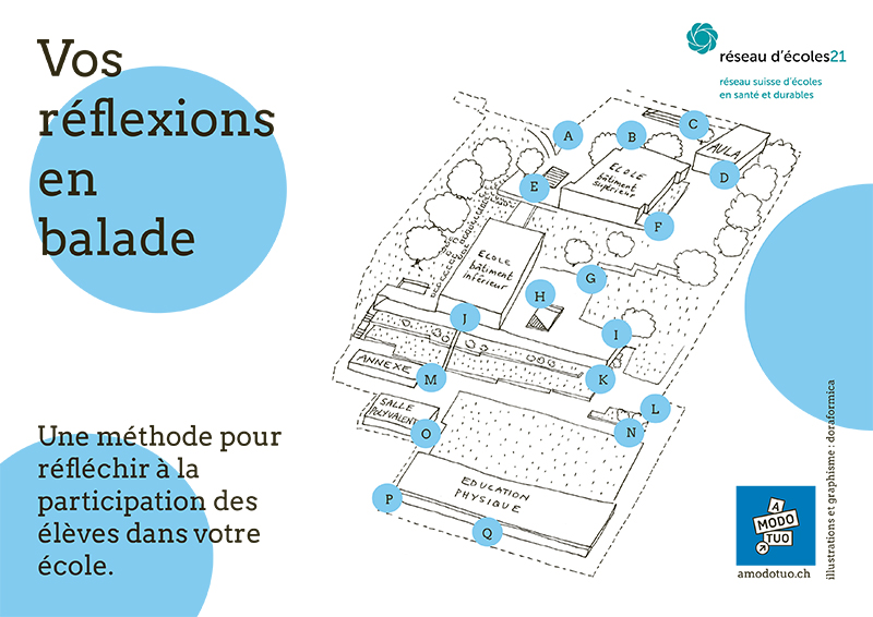 Le Réseau d'écoles21, Réseau suisse d'écoles en santé et durables propose un outil concret et prêt à l'emploi pour explorer comment aller de l'avant dans son école. Sachant qu'une balade en extérieur offre le terreau idéal pour favoriser la naissance et l’exploration de nouvelles idées: associer ses jambes à sa tête pour se mettre en mouvement –au sens propre comme au figuré.Recrée ta cour