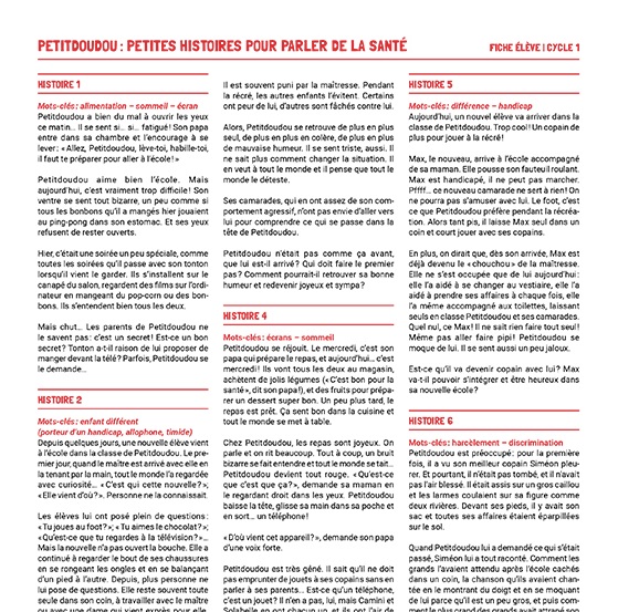La fiche propose une approche transversale et pluridisciplinaire de la notion de santé. Une approche qui prend en compte non seulement des composantes physiques et psychiques, mais également sociales, économiques et environnementales, telles que définies dans l’éducation en vue d’un développement durable (EDD).Apprendre sur la santé et la promotion de la santé à l'école