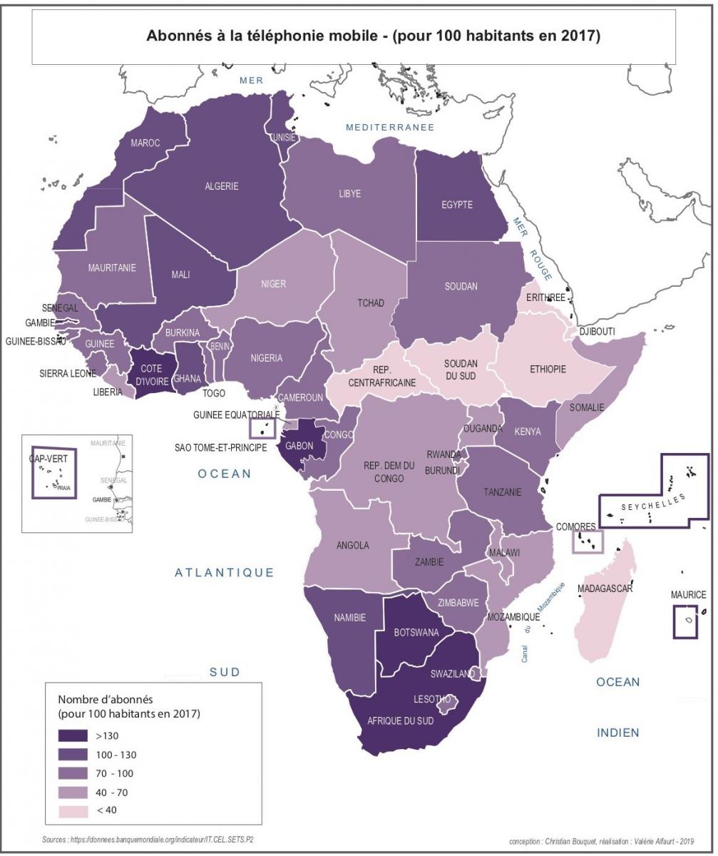 Source: Carte. Combien d’abonnés à la téléphonie mobile en Afrique ? (01.2020)Pour de nombreux Africain-e-s, un smartphone est désormais presque aussi important que l’électricité, l’eau ou les toilettes. Selon l’institut britannique d’études de marché Ovum, près de 294 millions d’Africain-e-s ont utilisé un smartphone en 2016, et ce nombre a doublé au cours des trois dernières années. D’ici 2021, ce nombre devait dépasser les 900 millions.
