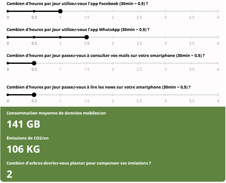 Grâce au calcul de l'empreinte carbone, vous pouvez estimer votre consommation annuelle moyenne de données mobiles et les émissions de CO2 associées en quelques secondes. Le résultat indique également le nombre d'arbres que vous devriez planter chaque année pour compenser vos émissions. Voici un exemple de calcul: