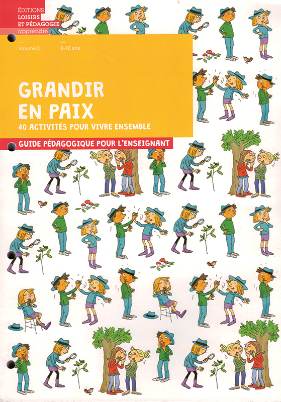 3ème volume de la collection Grandir en paix, 40 activités à l'intention des 8-10 ans. Concrètes, ludiques et participatives elles permettent de favoriser le développement de compétences telles que l'empathie, la solidarité, la gestion de conflits, le respect des différences ainsi que le respect de l'environnement, tout en favorisant la réussite scolaire et le développement harmonieux et sain de l'enfant. Le carnet d'élèves vendu séparément n'est pas indispensable mais facilite les liens avec les familles. Chaque activité présente : l'enjeu, les objectifs, les liens au Plan d'études romand (PER), des pistes de réflexion et des prolongements ou variantes, le déroulement, le matériel et le temps nécessaire. Ouvrage très riche et agréable où les enseignants peuvent puiser à leur guise et à leur rythme. Organisé autour de 7 séries de séquences: Bien dans ma tête, Bien dans mon corps, Bien dans ma classe, Bien sur ma planète, Bien dans la société, Bien connecté(e), Bien dans la diversité. Une très belle et utile ressource pour tisser des liens entre les dimensions et thèmes du développement durable: vivre ensemble, alimentation, nature, émotions, culture, différences, etc.