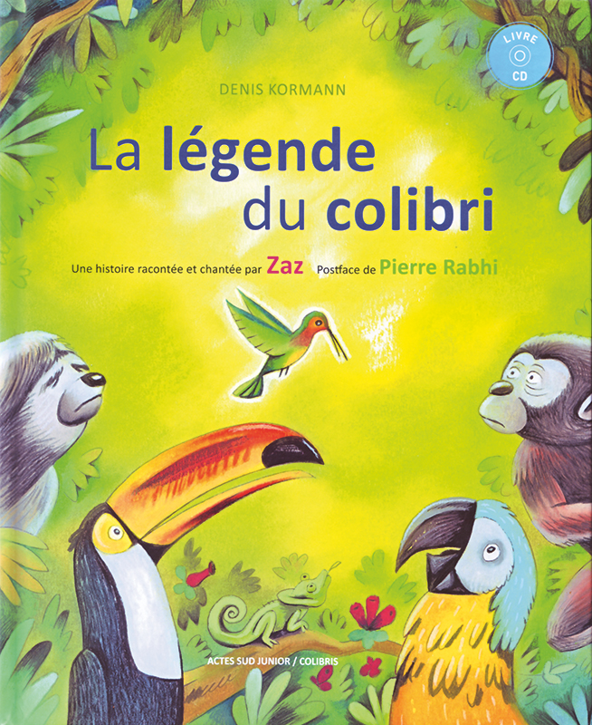 Ce petit livre imagé à l'intention des enfants de 5 à 8 ans est accompagné d'un CD avec 2 chansons et lecture du conte inspiré d'une légende amérindienne. Les animaux terrifiés assistent impuissants à l'incendie de leur forêt. Seul le colibri s'active et cherche quelques gouttes d'eau avec son bec pour les jeter sur le feu. Les animaux s'interrogent sur l'utilité de l'énergie déployée par le colibri auquel il répond : « Je sais bien que je n'y arriverai pas tout seul mais je fais ma part ». Ce conte est un point de départ symbolique pour imaginer comment chacun-e à sa manière peut contribuer à changer le monde, idéal pour débuter une réflexion en vue de l’Education en vue d’un développement durable avec les plus jeunes. L’exemple du colibri permet aux enfants de s’identifier à leur mesure sur les impacts possibles de leurs actes sur l’environnement. Il montre aussi que lorsqu’un seul être s’y met, bien que fort petit, il encourage chacun-e à s’unir aux autres pour trouver de nouvelles forces.