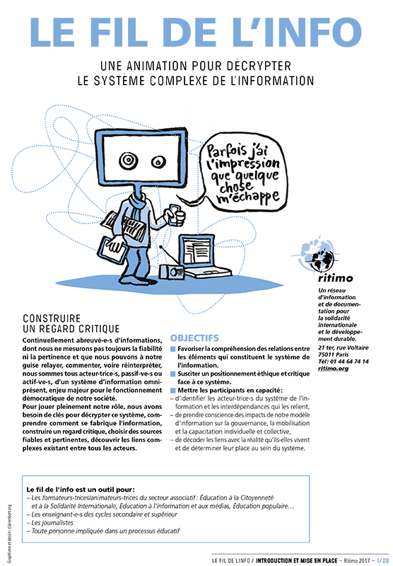 Cette activité destinée aux élèves du postobligatoire aborde, sous forme de jeu de rôle, les enjeux complexes liés à la question de l’information. Chaque étudiant-e incarne un « personnage » du système comme : la source, la publicité, Google, une journaliste, un consommateur d’information ou encore le climat. Les interactions entre ces différents éléments sont représentées par une ficelle qui relie les participant-e-s et permet de visualiser les liens d’interdépendance au niveau social, économique, politique et environnemental. En plus de développer des connaissances, cette activité permet aux apprenant-e-s d’adopter un positionnement critique face à l’information et à situer leur propre rôle au sein du système. Cette réflexion pourra nourrir le développement de projets individuels ou collectifs, dans une approche d’éducation à la citoyenneté. A noter que la ressource a été développée par un réseau français d’information et de documentation pour la solidarité internationale et le développement durable. De ce fait, une partie des « personnages » renvoie au système français et nécessitera une adaptation de la part de l’enseignant-e qui souhaite animer cette activité en classe.