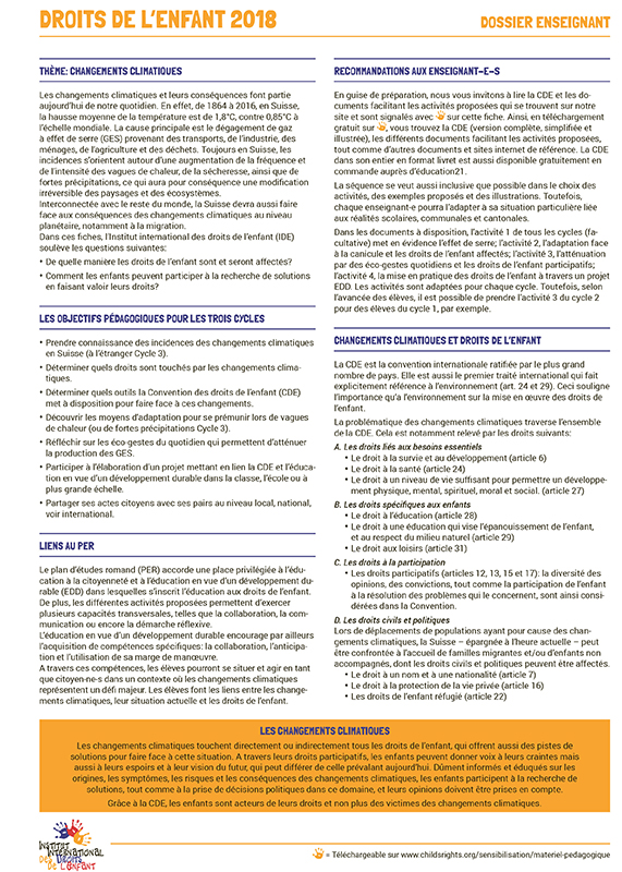 Ces fiches Droits de l'enfant abordent le thème des changements climatiques. Elles proposent de se poser les questions suivantes: De quelle manière les droits de l'enfant sont et seront affectés ? Comment les enfants peuvent participer à la recherche de solutions en faisant valoir leurs droits ? A travers les droits participatifs, les enfants peuvent donner voix à leurs craintes mais aussi leurs espoirs et à leur vision du futur qui peut différer de celle prévalant aujourd'hui. En exerçant des compétences comme la collaboration et l'utilisation de sa marge de manouvre, les élèves pourront se situer et agir en tant que citoyen-ne-s dans un contexte où les changements climatiques représentent un défi majeur.