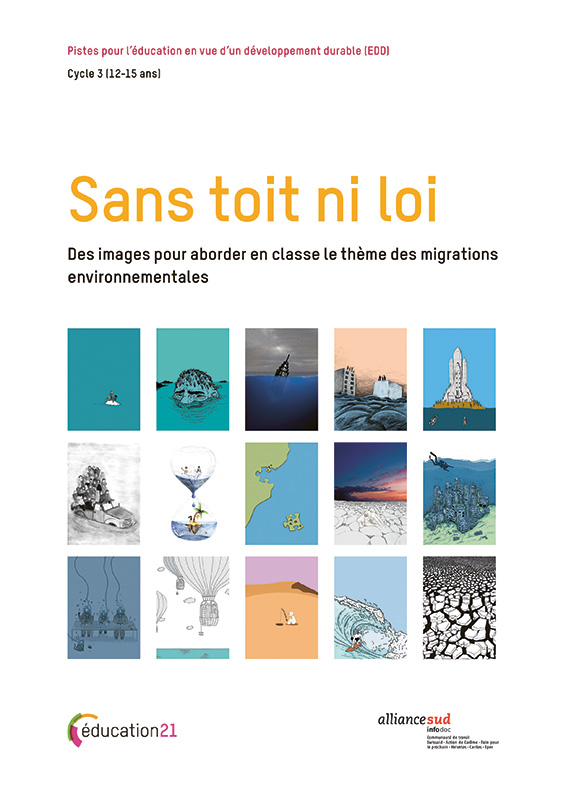 Ce dossier pédagogique est construit autour de 15 images réalisées par des étudiant-e-s de graphisme de l'école cantonale d'arts du Valais (ECAV) dans le cadre d'un concours sur les migrations environnementales. Le dossier pédagogique contient une introduction thématique proposant une information de base sur la thématique des migrations environnementales, ainsi que ses principaux enjeux et trois activités clé-en-main s'appuyant sur les images. Ces activités permettent notamment d'identifier quelques causes et conséquences des migrations liées à l'environnement, de se mettre à la place d'un « réfugié climatique » et d'imaginer des solutions pour le futur. Elles s'intègrent dans les objectifs du PER de SHS (géographie), de Formation générale et d'Arts visuels pour le cycle 3. La question des migrations environnementales soulève des enjeux sociaux, économiques, scientifiques, écologiques et politiques. Il s'agit d'une thématique aux multiples dimensions qui se prête particulièrement bien à l'éducation en vue d'un développement durable (EDD).