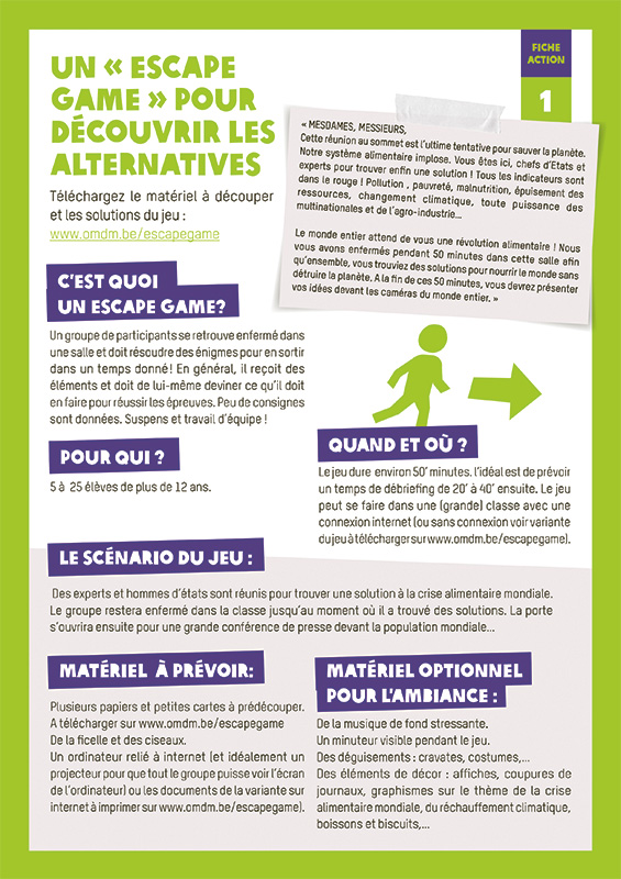 L'intérêt principal de cette ressource réside dans l'aspect jeu. Enfermés dans une salle, les participant-e-s, par groupe, ont 50 minutes pour résoudre diverses énigmes qui leur permettront de sortir. Il s'agit d'abord de comprendre la problématique (les conséquences du système alimentaire actuel), puis d'identifier différentes alternatives. Les participant-e-s en choisissent finalement une qu'ils présenteront soit aux autres groupes de participant-e-s soit à l'enseignant-e. Le jeu permet principalement de faire des liens entre différents éléments du système alimentation et de découvrir des alternatives possibles. Il ne propose malheureusement pas vraiment de développer la réflexion critique des participant-e-s. Il s'agit toutefois d'une bonne entrée en matière sur le thème. A noter quand même que l'effet jeu ne doit pas faire oublier le sérieux de la problématique, d'où l'importance du debriefing en fin de jeu.