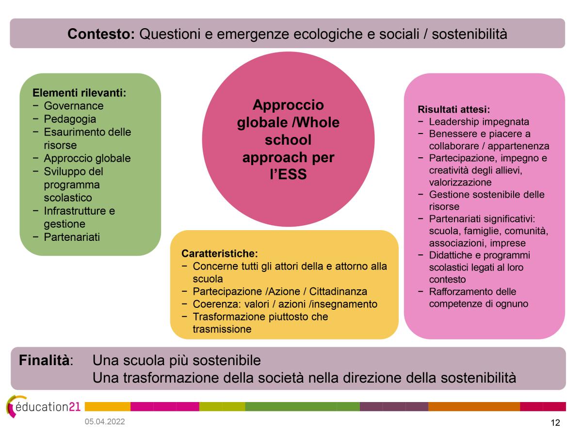 Un approccio globale ha come obiettivo “Vivere l’ESS in tutta la scuola”, mettendo l’accento su due punti: