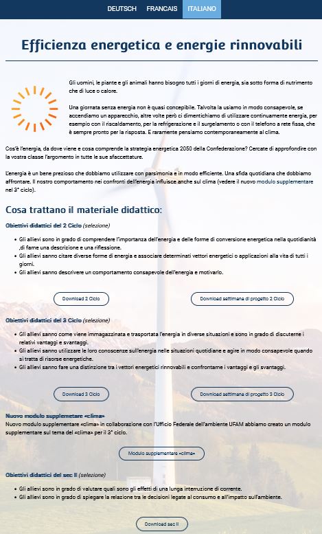 L'energia e l'elettricità accompagnano e influenzano la nostra vita quotidiana. (Informazioni specialistiche nelle conoscenze di base). Come possiamo, come società o persone singole, affrontare l'aumento dei nostri bisogni e della nostra domanda di ulteriore energia e di maggiori fonti energetiche rinnovabili quando sappiamo che le risorse naturali come il petrolio, il carbone, l'acqua, lo spazio fisico, ecc. scarseggiano sempre più? Ricollegandosi alle offerte didattiche e alle tematiche d'insegnamento esistenti, il dossier "Costruire il futuro dell'energia" propone materiale didattici, domande e offerte che fanno luce sul nostro attuale comportamento di consumo e si focalizzano sul futuro dell'energia a livello locale e globale.