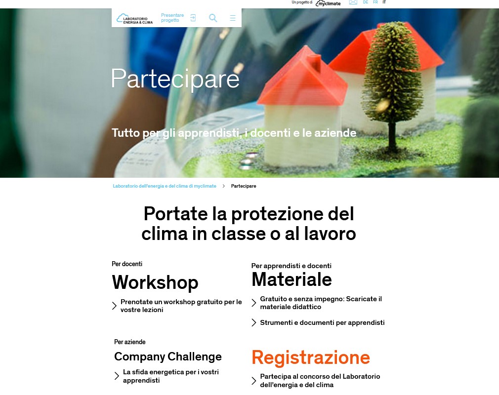 Il laboratorio di energia e clima è un progetto educativo di myclimate. Si rivolge agli apprendisti svizzeri del 1°-4° anno di apprendistato. Da soli o in team, gli apprendisti lavorano su semplici progetti nei settori del risparmio energetico, dell'efficienza energetica o delle energie rinnovabili sul posto di lavoro o nella vita quotidiana. I materiali dei blocchi 1-3 possono essere usati per esempio in geografia nel 3° ciclo.Un ambiente pulito, verde, sano e sostenibile