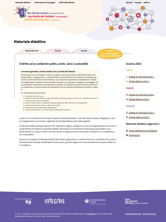 Il materiale didattico per la Giornata dei diritti dell'infanzia e dell'adolescenza 2023 è dedicato al tema dell'ambiente. Il diritto ad un ambiente pulito, verde, sano e sostenibile non è formulato in modo così esplicito nella Convenzione sui Diritti dell'Infanzia. Per questo motivo, nel giugno 2021, il Comitato ONU sui diritti dell'infanzia ha redatto un Commento generale sui diritti dell'infanzia e dell'ambiente, con un’attenzione particolare ai cambiamenti climatici.Insieme per salvare il mondo