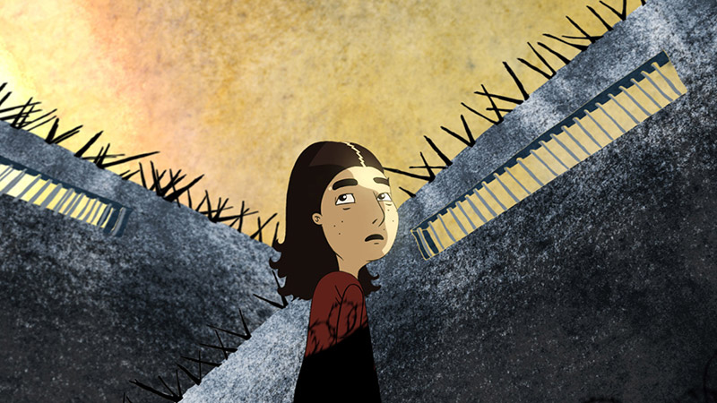 Una giraffa coraggiosa che si oppone alle ingiustizie viene cacciata dalla sua terra natia e arriva nel paese dei cani. Abbandonata a sé stessa lotta con le sue dimensioni, il cibo insolito e l’atteggiamento scostante dei cani. Alla fi ne trova lavoro e amicizia presso un giardiniere. Ma poi la sua richiesta d’asilo viene respinta.Frontière (Frontiera) (film d’animazione, 5 min., VOD)