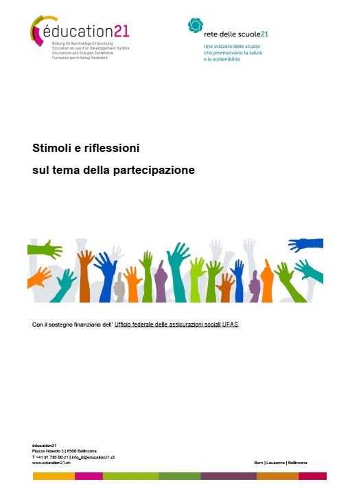 Nell'ottica di un'educazione allo sviluppo sostenibile, la partecipazione può assumere diverse dimensioni: può essere un diritto fondamentale, un principio d'azione e un approccio pedagogico privilegiato in materia di ESS o ancora un obiettivo educativo convalidato dal Piano di studio. Ma può anche essere una competenza trasversale per partecipare o costituire conoscenze e competenze in materia di partecipazione. Affinché le allieve e gli allievi acquisiscano conoscenze approfondite sulla partecipazione e possano allenare queste competenze fin da subito, le loro e i loro insegnanti, nonché le direzioni scolastiche devono dapprima migliorare la propria comprensione e le proprie competenze in materia di partecipazione. Speriamo che il dossier tematico “Vivere la partecipazione” vi contribuisca.