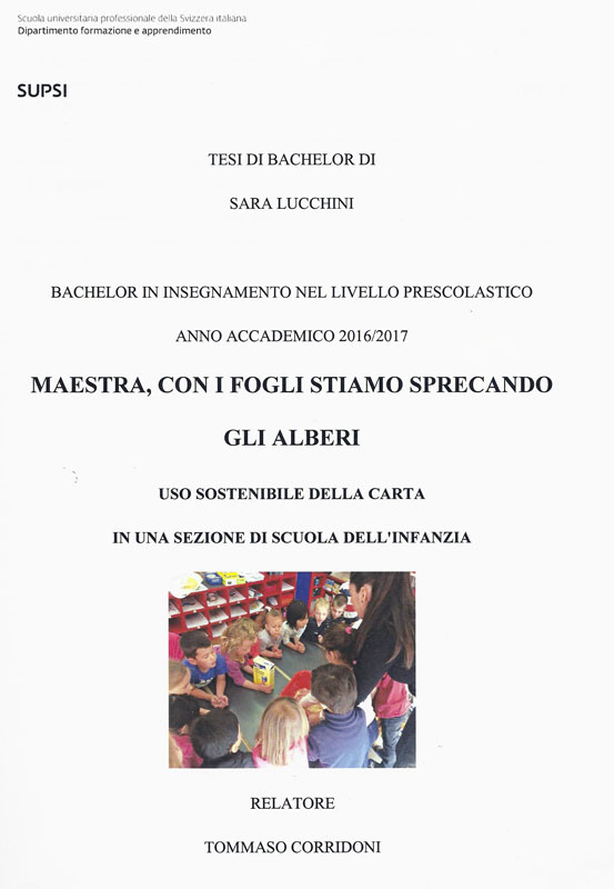 Nel presente lavoro di Bachelor sono state studiate le concezioni di bambini di Scuola dell'Infanzia sull’utilizzo sostenibile del materiale carta, verificando se possedessero già, e come costruissero, competenze di Educazione allo Sviluppo Sostenibile (ESS). La loro evoluzione è stata sostenuta con un itinerario didattico i cui interventi hanno sondato le idee dei bambini sui tipi di carta, i diversi metodi di riciclo/riutilizzo, giungendo fino a discutere regole di utilizzo che limitino lo spreco e la produzione a partire dal legno. I dati sono stati raccolti tramite osservazioni e registrazioni per poi essere appositamente analizzati e confrontati con quelli di una II elementare che ha lavorato sullo stesso tema. I risultati hanno mostrato che i bambini di SI sono legati agli aspetti concreti della carta. La riflessione sullo spreco porta i bambini a definire regole per il buon utilizzo della carta, per affetto e sensibilità verso la natura. Esprimendo competenze di ESS legate a valori e volontà di intervento, i bambini presentano un pensiero sostenibile, ma devono ancora stabilizzare i saperi. Il confronto con la classe elementare ha mostrato similitudini rilevanti ma con differenze per lessico e astrazione.