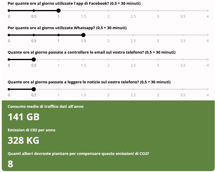 Con il calcolo dell’impronta ecologica è possibile stimare in pochi secondi il proprio consumo medio annuo di dati mobili e le relative emissioni di CO2. Inoltre, nel risultato è indicato anche quanti alberi si dovrebbero piantare ogni anno per compensare le proprie emissioni. Ecco un esempio di calcolo:
