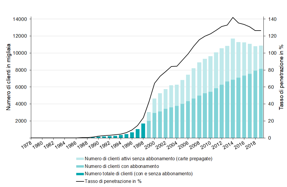 In Svizzera, dall'introduzione nell'ottobre 1996 della prima carta telefonica mobile prepagata, il numero di utenti di telefonia mobile è cresciuto costantemente. Nel 2018, c'erano 10.788.602 clienti (con e senza abbonamenti), per una popolazione di 8.545.000 persone che significa un tasso di penetrazione del 126,3%. Il 99% dei giovani svizzeri tra i 12 e i 19 anni possiede un telefono cellulare, la maggior parte dei quali sono smartphone.